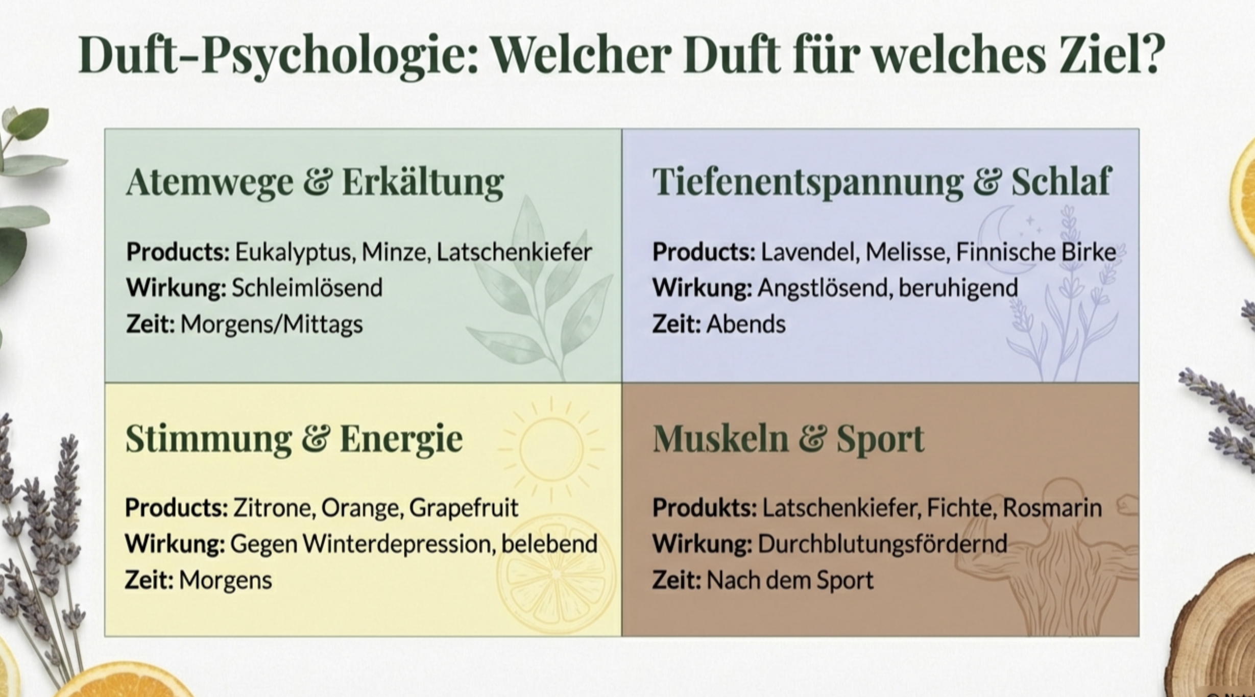 - Wirkung bestätigt: Eukalyptus und Minze wirken nachweislich atembefreiend, Lavendel entspannend, Zitrus belebend – im Test durch Befragungen und Messungen verifiziert